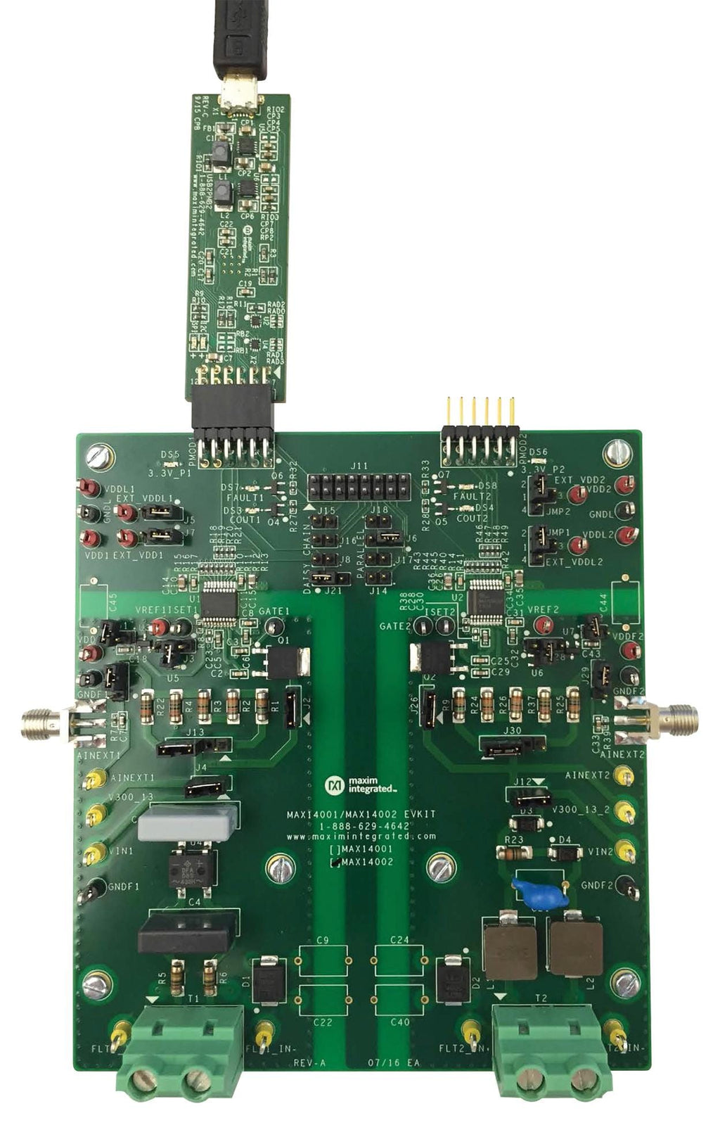 - Kit Contents: Eval Board MAX14001, USB2PMB2 Adapter Board, Micro-USB Cable