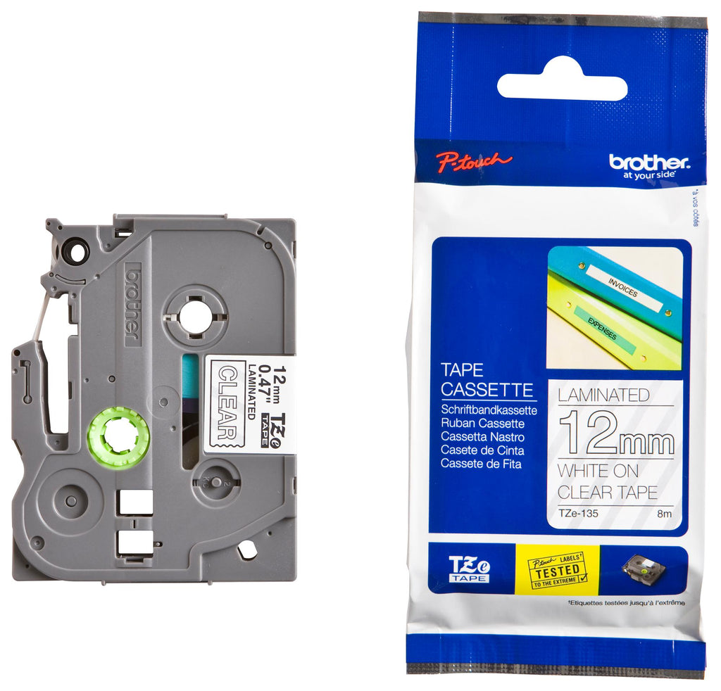 TZE-135 Tape, White On Clear, 12mm W, 8m L Brother
